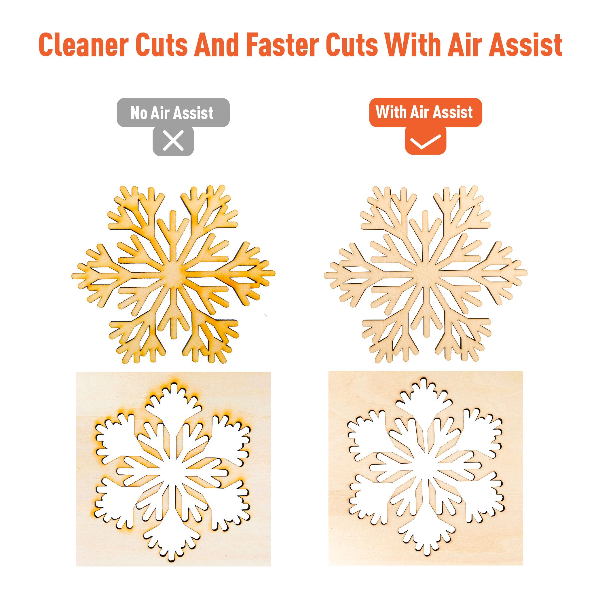 Clean Surface & Smooth Edge - ACMER air assist pump uses air to quickly reduce the temperature of the cut material surface, preventing distortion and discoloration due to high temperatures, ensuring smooth lines,complete patterns, and clean material surfaces. You will have a better artwork result with this air pump.