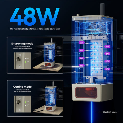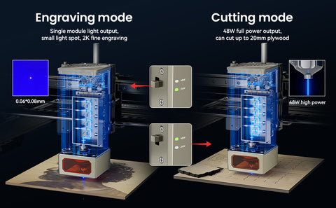 2. One Key Switch 24W/48 Mode: ATOMSTACK A40/S40/X40 PRO/MAX adopts a new laser design, it can switch between 24W and 48W output power with one key by physical button. For different work of engraving and cutting open different modes, ATOMSTACK A40/S40/X40 PRO/MAX can be both fine engraving and powerful output.