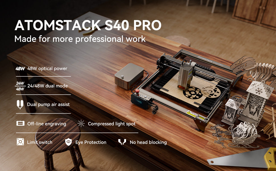 1. High Power 48W Laser Output: ATOMSTACK A40/S40/X40 PRO/MAX, the cutting-edge laser engraver, has the highest 48W optical power in the industry for professional work and greatly improves work efficiency. He can cut through 18mm basswood, pine and tung wood, 9mm mdf density board and 0.1mm stainless steel sheet at one time.